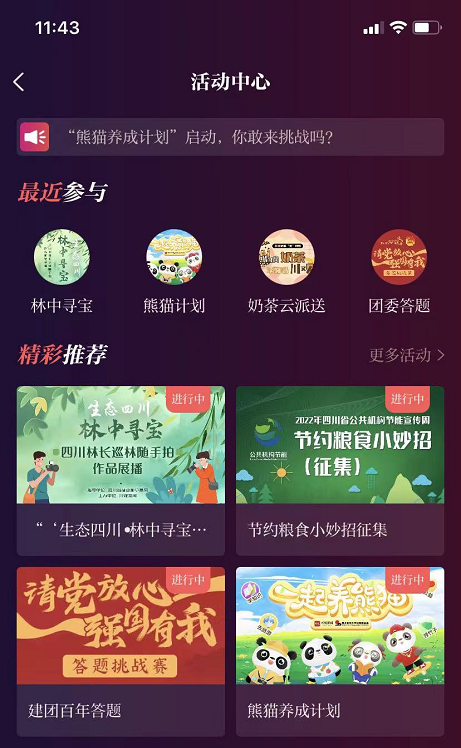 方式二:在川观新闻首页,手指右滑进入“活动中心”,点击活动图片即可参与点赞;