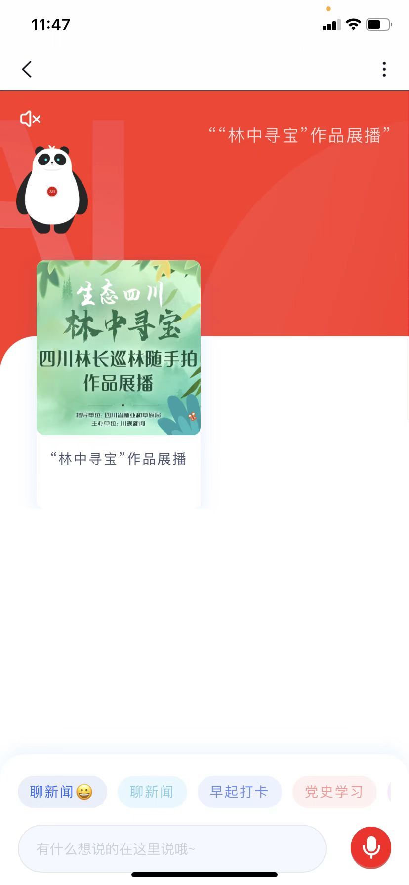 方式三:点击川观新闻首页顶端右上角“大川机器人”,回复“林中寻宝点赞”,对话框将弹出活动图片,点击图片即可参与活动。