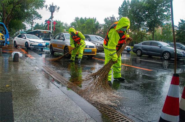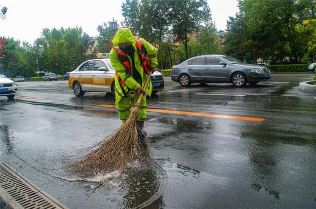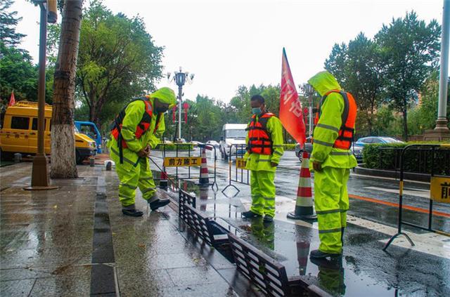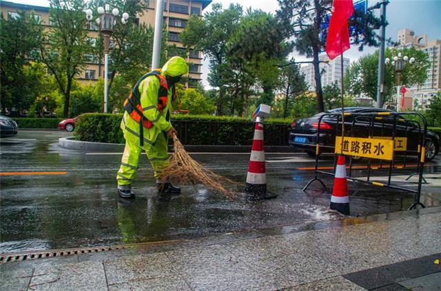 6月27日至6月28日,长春市迎来大到暴雨,长春市维管中心出动工作人员彻夜战斗,清理积水,防止出现内涝,保障道路畅通。图为在东北师范大学附近的值守人员在清理积水。