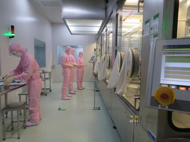 换好无菌服,戴上工作帽、口罩,穿好鞋套,洗手消毒,再穿过三道门,才能透过玻璃窗瞄一眼制药生产线。