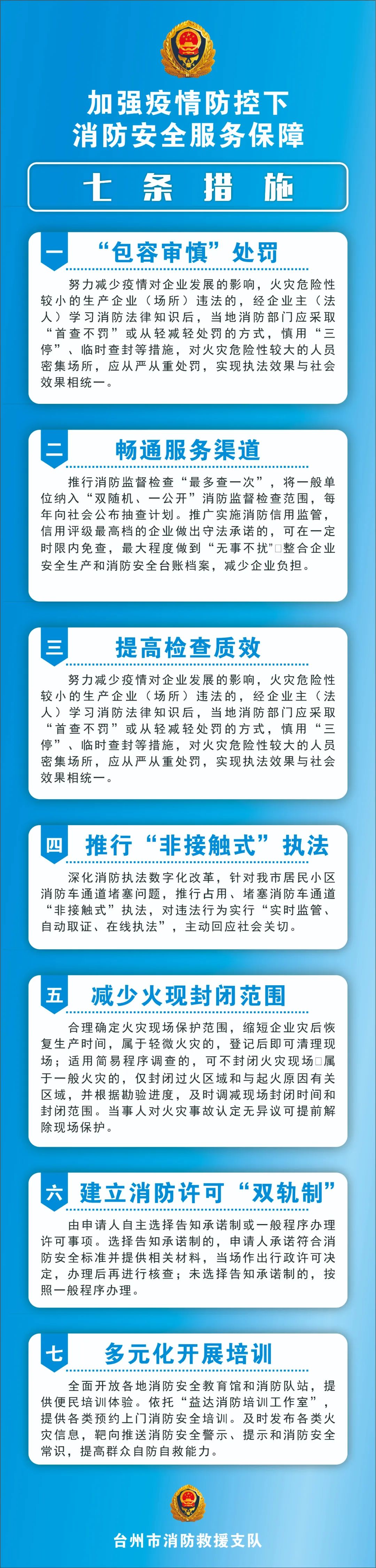 为认真贯彻落实党中央“疫情要防住、经济要稳住、发展要安全”的明确要求和国务院稳经济一揽子政策措施,台州市消防救援支队主动担当、积极作为,及时回应疫情影响下企业消防安全期望和需求,在牢牢把握“防大控小”的基础上,强化疫情防控下消防安全护航保障服务经济发展大局。