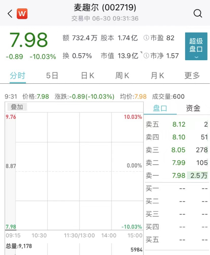 麦趣尔(002719.SZ)瞬间跌停,