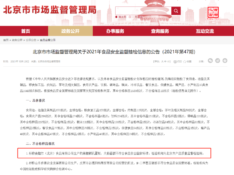 除此之外,去年麦趣尔生产的黑糖鲜乳蛋糕也被检出不合格。2021年10月29日,北京市市场监督管理局发布关于2021年食品安全监督抽检信息的公告(2021年第47期),其中,标称麦趣尔(北京)食品有限公司生产的黑糖鲜乳蛋糕(120克/盒、20210419),大肠菌群不符合食品安全国家标准。检验机构为北京市产品质量监督检验院。