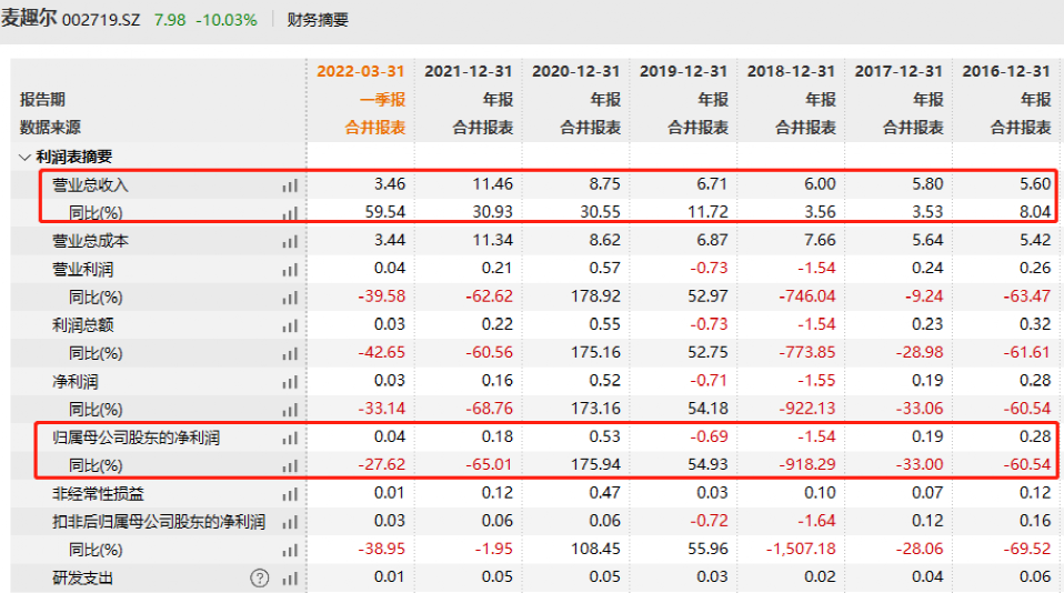 业绩方面,麦趣尔公布2022年第一季度报告,公司实现营业收入3.46亿元,同比增长59.54%;归属于上市公司股东的净利润385.37万元,同比下降27.62%;基本每股收益0.0221元。
