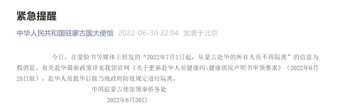 6月30日,中国驻蒙古国大使馆发布紧急提醒称,今日,在蒙脸书等媒体上转发的“2022年7月1日起,从蒙古赴华的所有人员不再隔离”的信息为假消息。有关赴华最新政策详见我馆官网《关于更新赴华人员健康码\健康状况声明书申领要求》(2022年6月28日版)。赴华人员抵华后按当地政府防疫规定进行隔离。