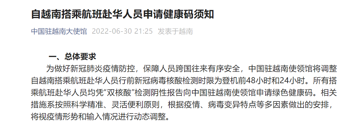 为做好新冠肺炎疫情防控,保障人员跨国往来有序安全,中国驻越南使领馆将调整自越南搭乘航班赴华人员行前新冠病毒核酸检测时限为登机前48小时和24小时。所有搭乘航班赴华人员均凭“双核酸”检测阴性报告向中国驻越南使领馆申请绿色健康码。相关措施系按照科学精准、灵活便利原则,根据疫情、病毒变异特点等多因素做出的安排,将视疫情形势和输入情况进行动态调整。