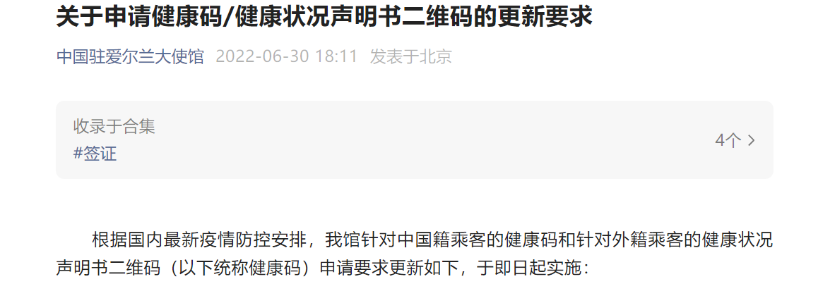 6月30日,中国驻爱尔兰大使馆发布消息称,根据国内最新疫情防控安排,我馆针对中国籍乘客的健康码和针对外籍乘客的健康状况声明书二维码(以下统称健康码)申请要求更新如下,于即日起实施: