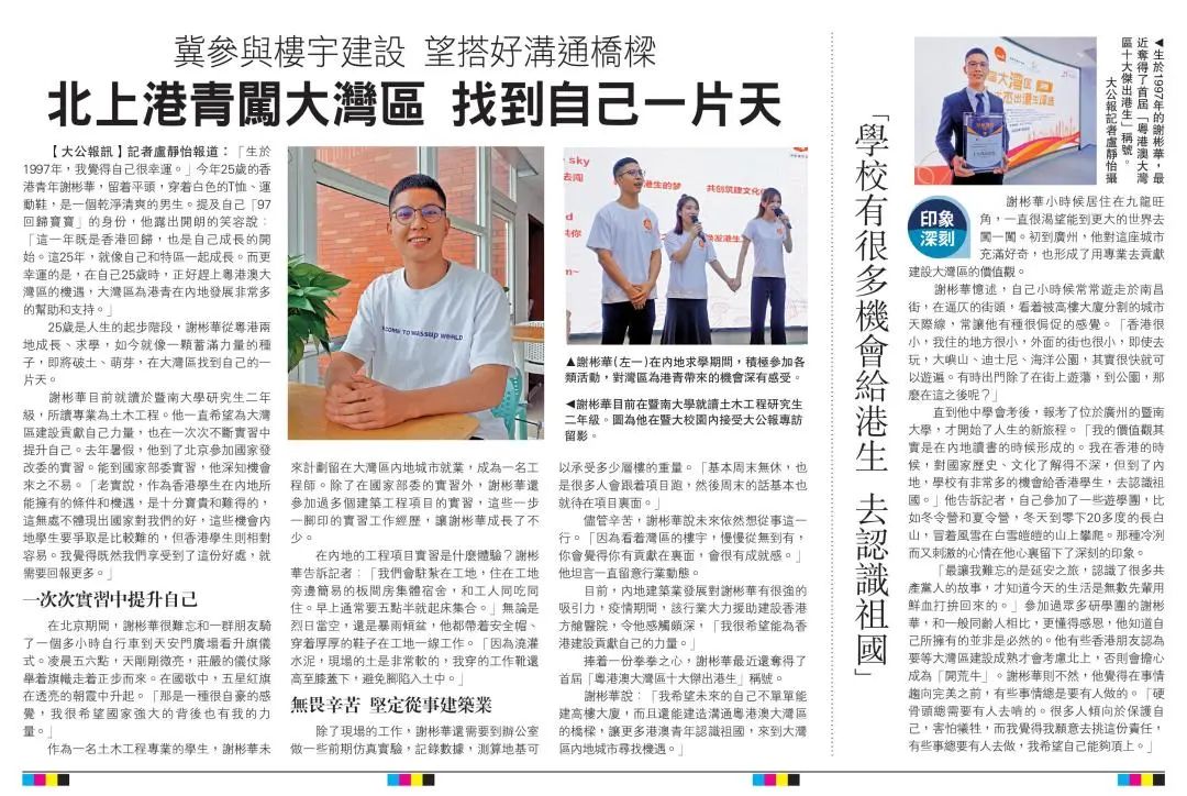 直到他中学会考后,报考了位于广州的暨南大学,才开始了人生的新旅程。“我的价值观其实是在内地读书的时候形成的。我在香港的时候,对国家历史、文化了解得不深,但到了内地,学校有非常多的机会给香港学生,去认识祖国。”他告诉记者,自己参加了一些游学团,比如冬令营和夏令营,冬天到零下20多度的长白山,冒着风雪在白雪皑皑的山上攀爬。那种冷冽而又刺激的心情在他心里留下了深刻的印象。