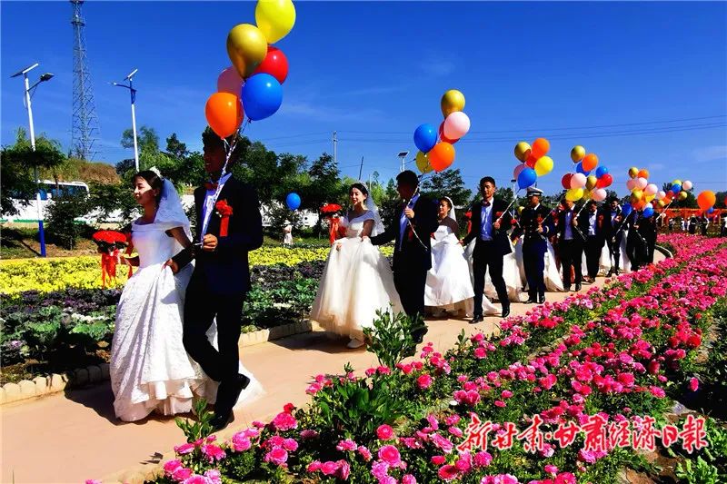 “携手婚姻殿堂,感受幸福和政”。蓝天白云,花海芳香。6月24日,和政首届集体婚礼在太子山下大南岔河畔举行。来自不同战线的20对中青老夫妻,身着圣洁的婚纱,伴着优美的花儿,携手漫步在和政县大南岔河花海长廊、新营镇尕庄油菜花海,参加“携手婚姻殿堂 ,感受幸福和政”首届集体婚礼。