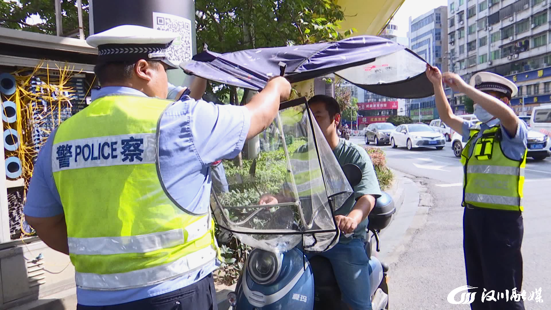 云梦县交警大队民警陈小龙:“在这里我还是呼吁大家,在驾驶的过程中,要文明出行,不要加装遮阳伞。”