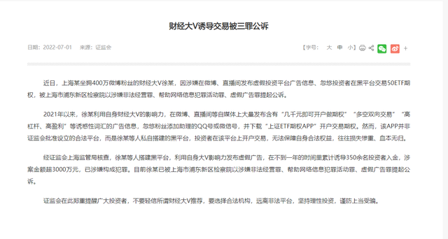 据证监会网站7月1日消息,近日,上海某坐拥400万微博粉丝的财经大V徐某,因涉嫌在微博、直播间发布虚假投资平台广告信息、忽悠投资者在黑平台交易50ETF期权,被上海市浦东新区检察院以涉嫌非法经营罪、帮助网络信息犯罪活动罪、虚假广告罪提起公诉。