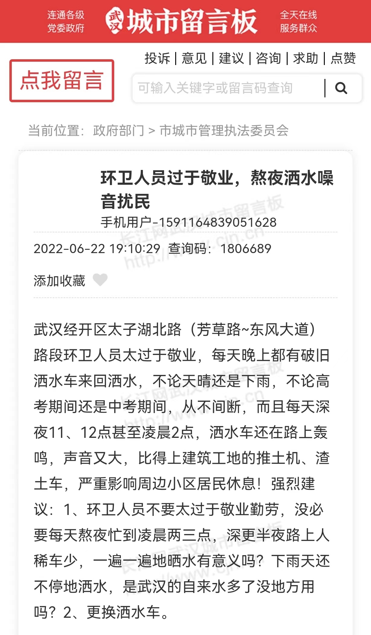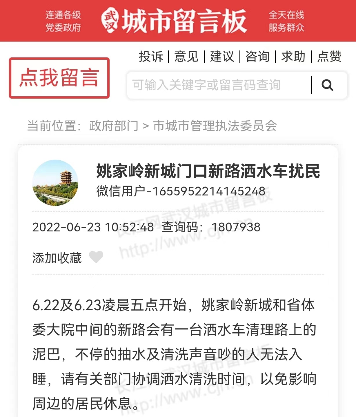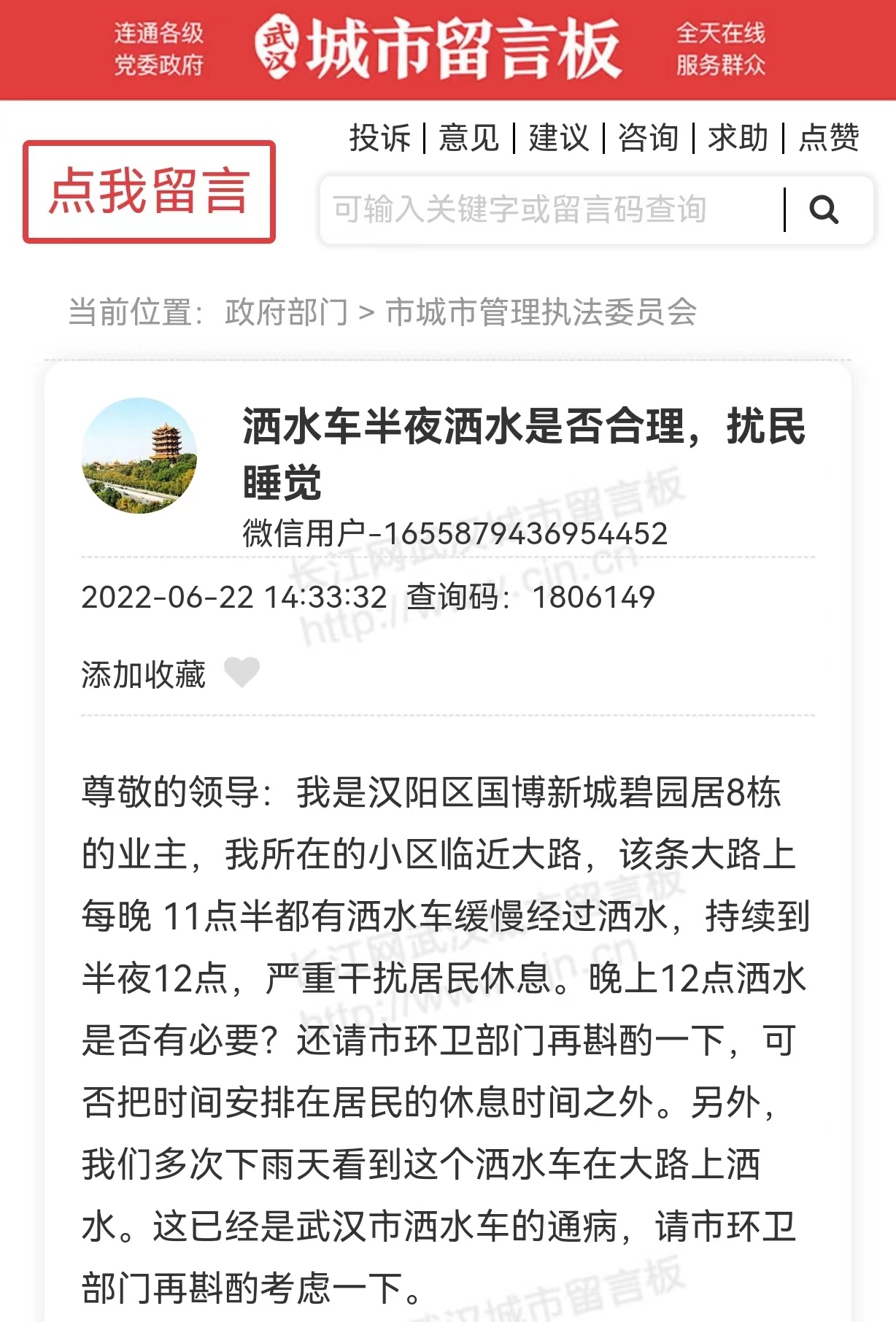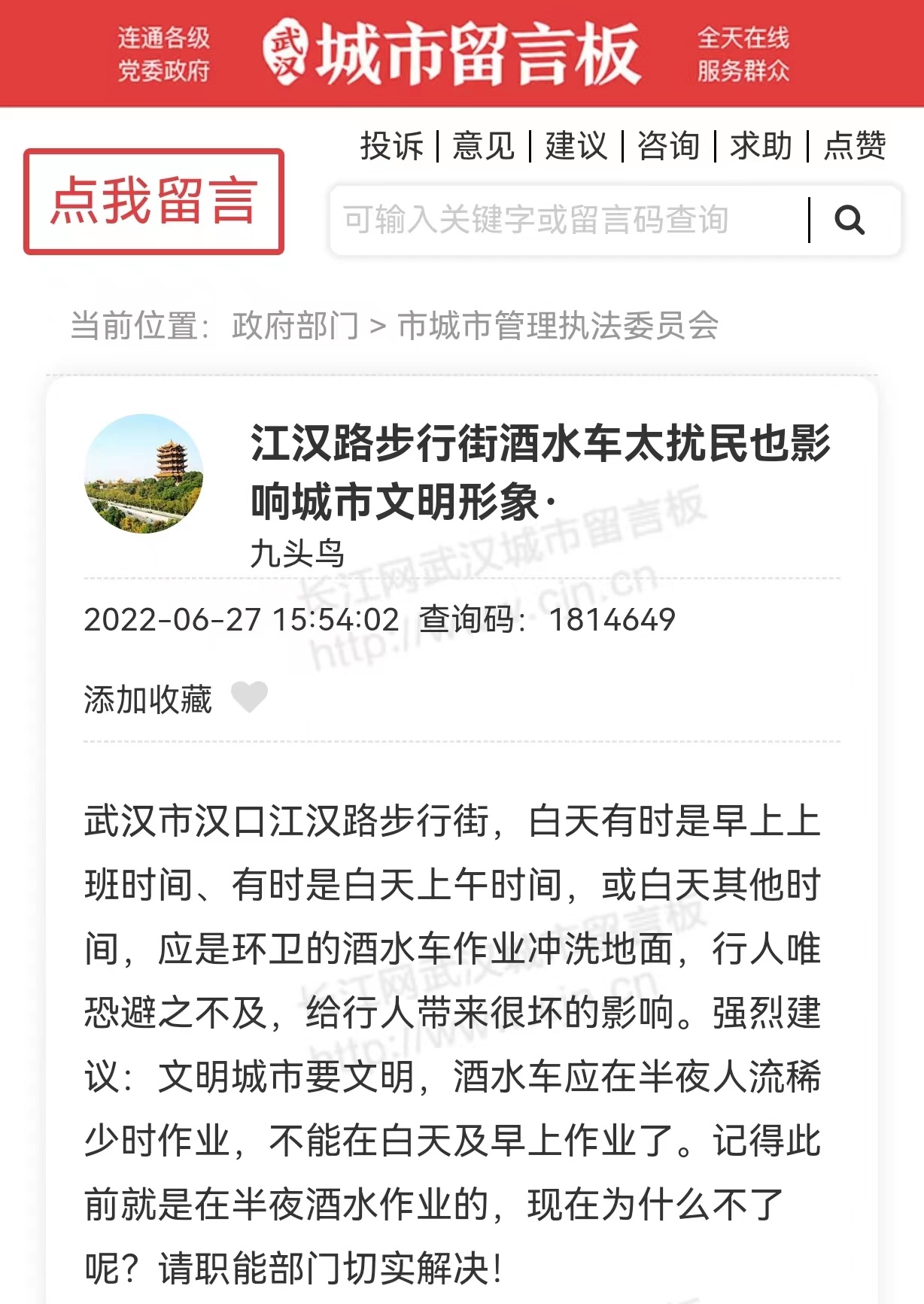 近日,有网友在武汉城市留言板反映