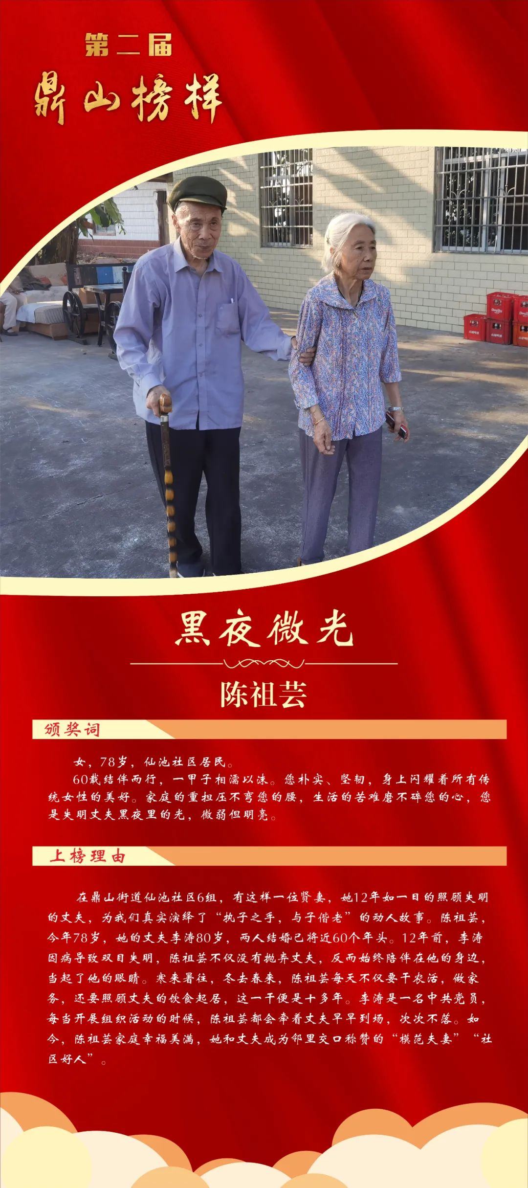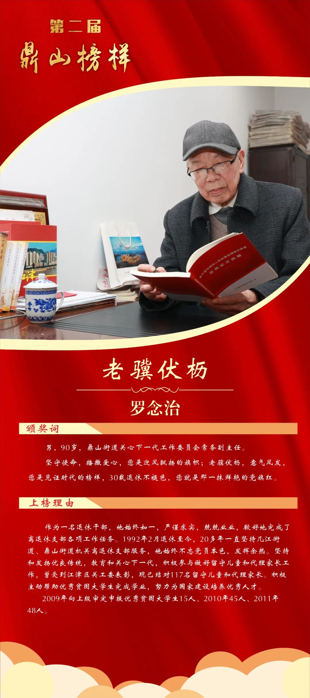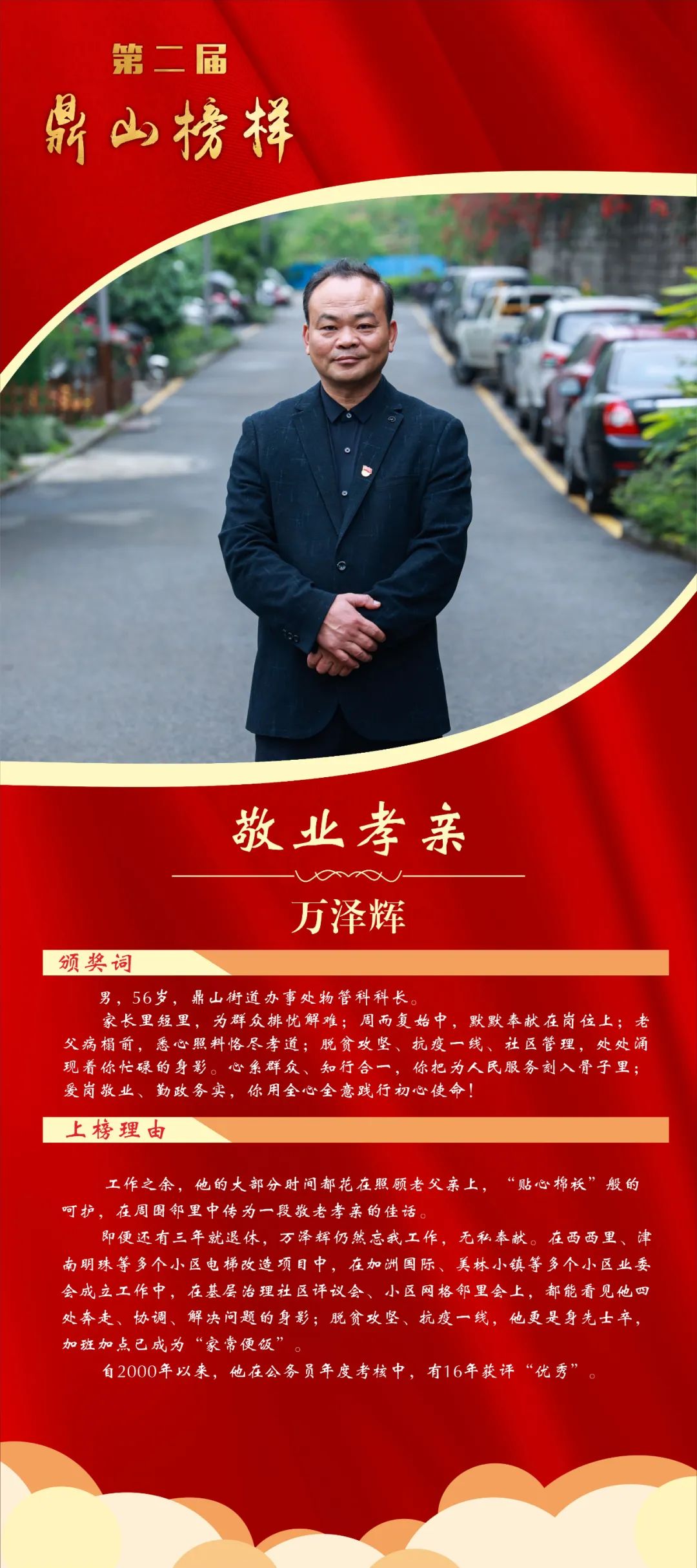 每年举办“鼎山榜样”评选活动,是鼎山街道培育和践行社会主义核心价值观的重要举措。此次评选活动主题为“选树向上向善榜样,厚植见贤思齐沃土”,目的是夯实鼎山街道基层治理的德治教化风尚,不断将创建全国文明城区引向深入。经过历时半年的宣传发动、推选候选人、初评、复评、终评等环节,活动最终推选出10名“鼎山榜样”和100名“活力鼎山·五星”。