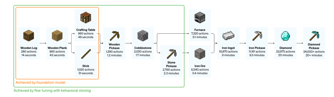 而到了最近,知名AI科技公司OpenAI终于实现了技术突破,提前杀死了比赛。根据他们于6月23日发布的论文来看,由他们训练的AI已经做到了熟练游玩《我的世界》,挖钻石对他们家的AI来说早已不在话下,毕竟它目前已经掌握了只有人类才能领悟的高阶玩法: