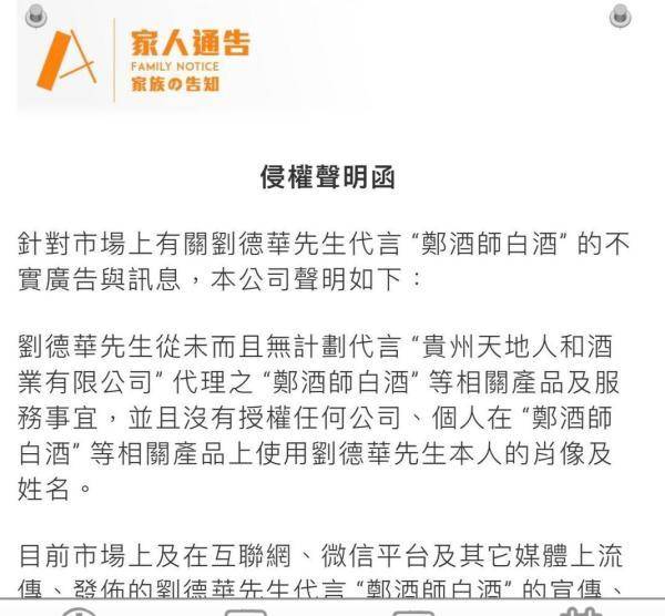 6月30日,刘德华经纪公司亨泰环宇发布声明,针对市场上有关刘德华代言一款白酒的广告与讯息予以否认,称刘德华从未而且无计划代言该品牌白酒,且没有授权任何公司、个人在此白酒产品上使用刘德华本人的肖像及姓名。目前网络流传的宣传、产品包装及报道均为虚假广告与不实新闻,公司会对上述侵犯刘德华肖像权、姓名权等行为进行调查并保留法律追诉权利。