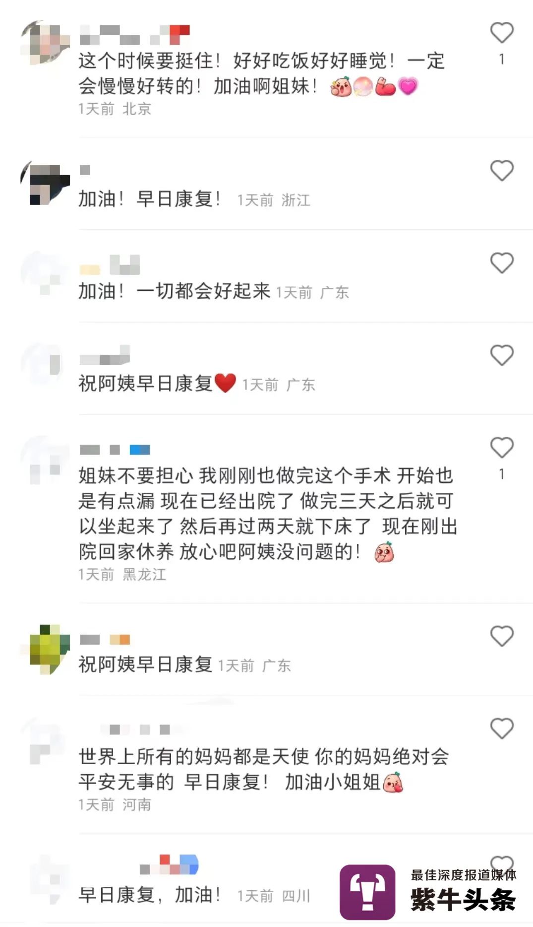 小张告诉紫牛新闻记者,随着自己和妈妈受到网友关注,也有部分网友质疑她靠母亲的病情博流量,诱导网友互动,甚至举报了她的帖子。她坦言,将母亲治病的经历发到网上并不是为了火,“我对‘火了’没有任何概念,因为妈妈生病了,我没有人可以诉说,就发到网上倾诉,我只是把社交平台当成一个树洞。”
