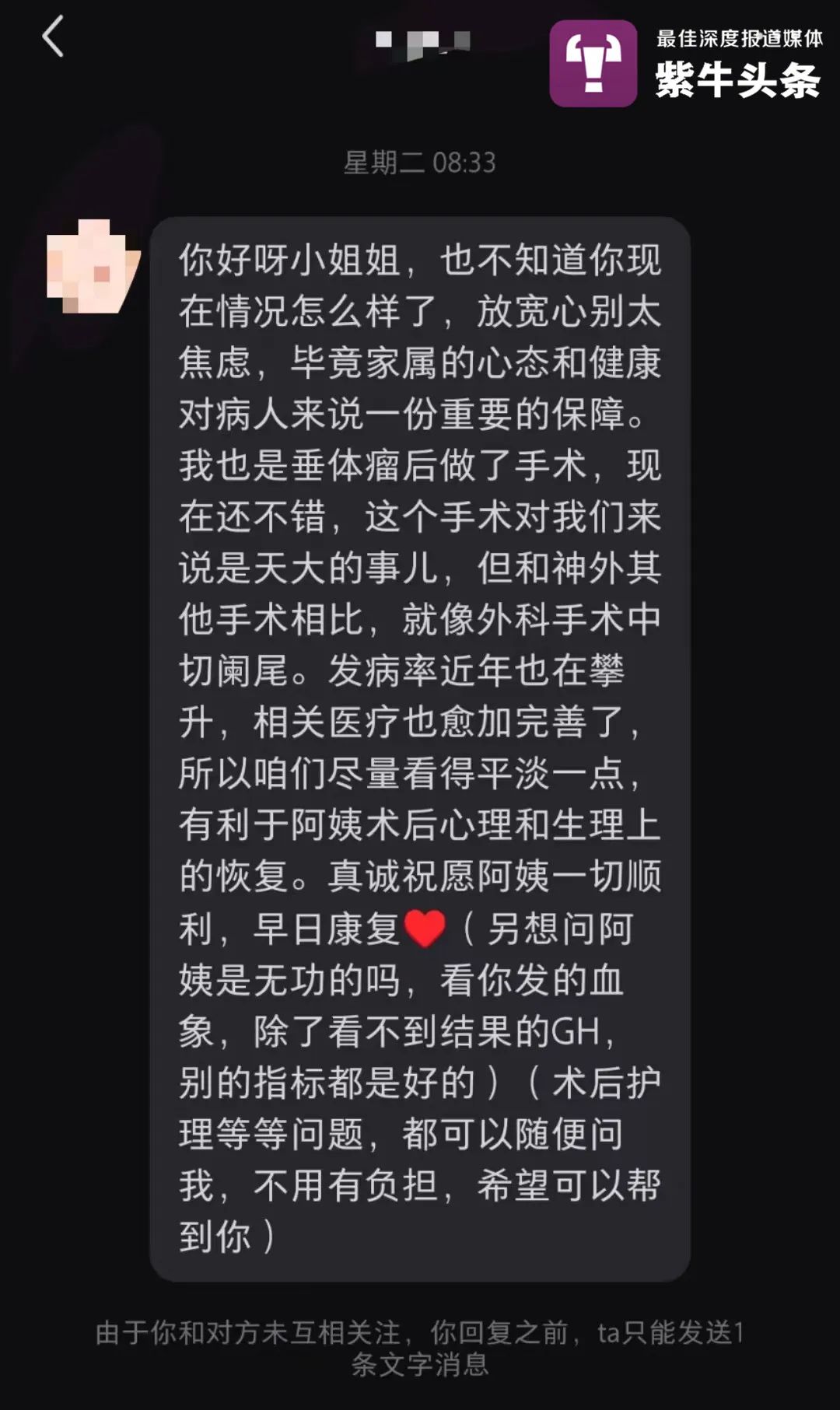 记者看到,有一位网友评论说:“去年8月,我的妈妈做了开颅手术,同一家医院,同一间手术室大门,在门外等待的几个小时像过了好几年,不过一切都挺过来了。”还有网友私信小张:“小姐姐,放宽心,别太焦虑。毕竟家属的心态和健康对病人来说是一份重要的保障。我也得了脑垂体瘤,后来做了手术,现在恢复得不错,这个手术对我们来说是天大的事,但和其他手术相比,就像切阑尾。现在医疗条件提高了,所以不要太担心。”