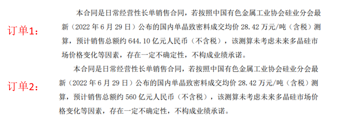 公司于近日与包头美科硅能源有限公司(以下简称美科硅能源)签订多晶硅长单销售合同。根据合同,买方在2022年—2027年预计向卖方合计采购25.61万吨多晶硅产品。同样根据该价格,预计销售总额约644.10亿元人民币(不含税)。