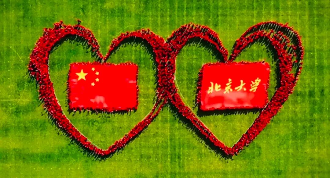作者说:北大教职工组成心形图案,一同舞动校旗和国旗,再度喊响“团结起来、振兴中华!”的时代强音,表达了“北大心,中国心,心心相连,同呼吸,共命运”的赤诚之心。