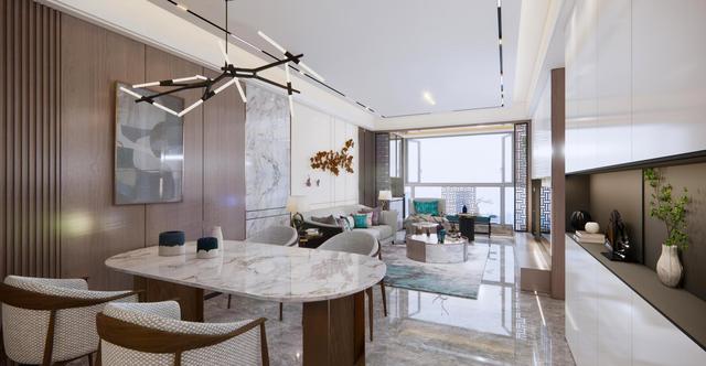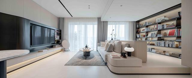 以我们帮保利设计的一个120平方米三房住宅样板间为例,我们将与客厅相连的书房墙面打通,整个客厅变成了5.8米大开间,客厅不再逼仄,连接客厅与书房的阳台进光量显著增多,升高地台设计打造了开放式亲子读书区,120平方米可以住出大平层的豪华感。