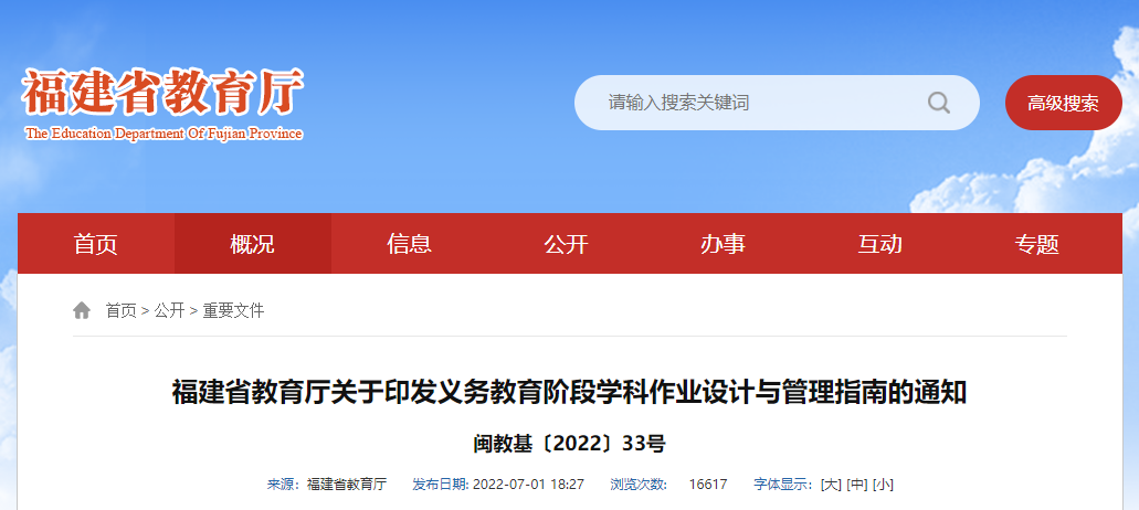 为深入贯彻中共中央办公厅、国务院办公厅《关于进一步减轻义务教育阶段学生作业负担和校外培训负担的意见》和我省《实施方案》精神,全面落实教育部办公厅《关于加强义务教育学校作业管理的通知》部署要求,有效指导我省义务教育阶段学校提高各学科作业管理与实施水平,我厅组织教研部门研究制定了义务教育各学科作业设计与管理指南(试行)。现印发给你们(下载地址:http://jyt.fujian.gov.cn“下载中心”栏目),并提出以下贯彻意见,请各地各校认真抓好落实。