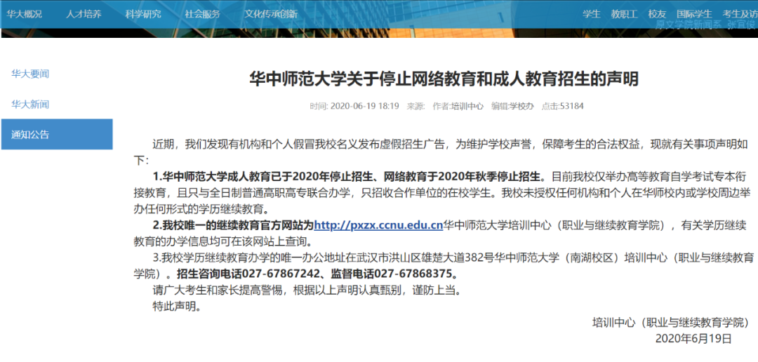 1.华中师范大学成人教育已于2020年停止招生、网络教育于2020年秋季停止招生。目前我校仅举办高等教育自学考试专本衔接教育,且只与全日制普通高职高专联合办学,只招收合作单位的在校学生。我校未授权任何机构和个人在华师校内或学校周边举办任何形式的学历继续教育。