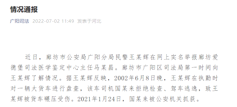 7月2日,河北省廊坊市广阳区司法局通报称:近日,廊坊市公安局广阳分局民警王某辉在网上实名举报廊坊爱德堡司法医学鉴定中心主任马某昌。廊坊市广阳区司法局第一时间向王某辉了解情况。据王某辉反映,2002年6月8日晚,王某辉在执勤时对一辆大货车进行盘查,该车司机国某来拒绝检查、驾车逃逸,致王某辉被货车碾压受伤。2021年1月24日,国某来被公安机关抓获。