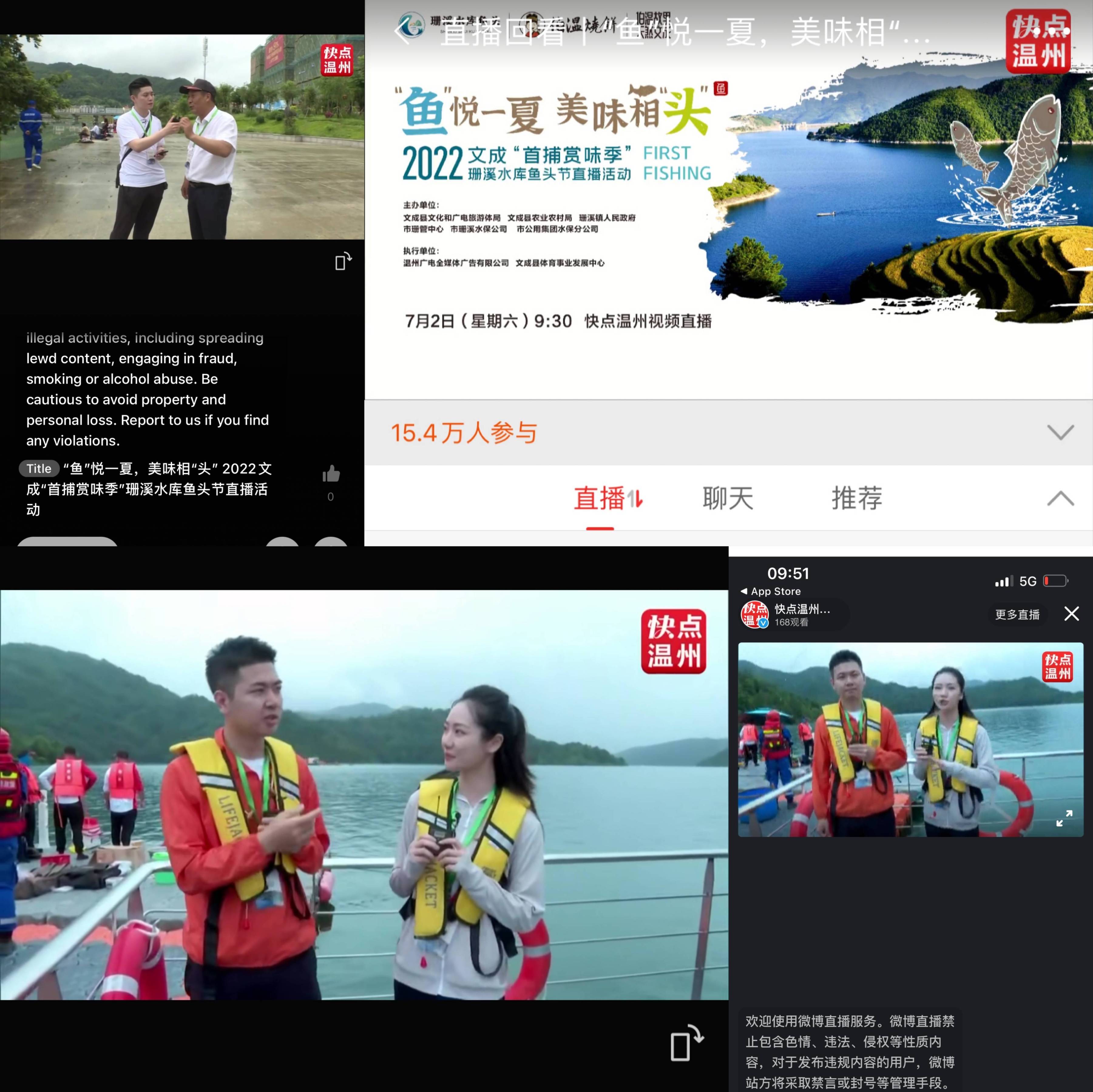 直播中,文成县钓鱼协会会长张仁健、钓鱼比赛参赛选手吴孔清、衢州龙游钓鱼协会会长郑镇、温州市钓鱼协会常务副会长周青、温州市公用集团珊溪水源保护分公司杜双双和钟金燕均接受了直播采访,进一步分享了珊溪水库优质的渔业资源优势和产业潜力,以及美味鲜鱼从水库到餐桌的全过程。