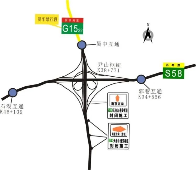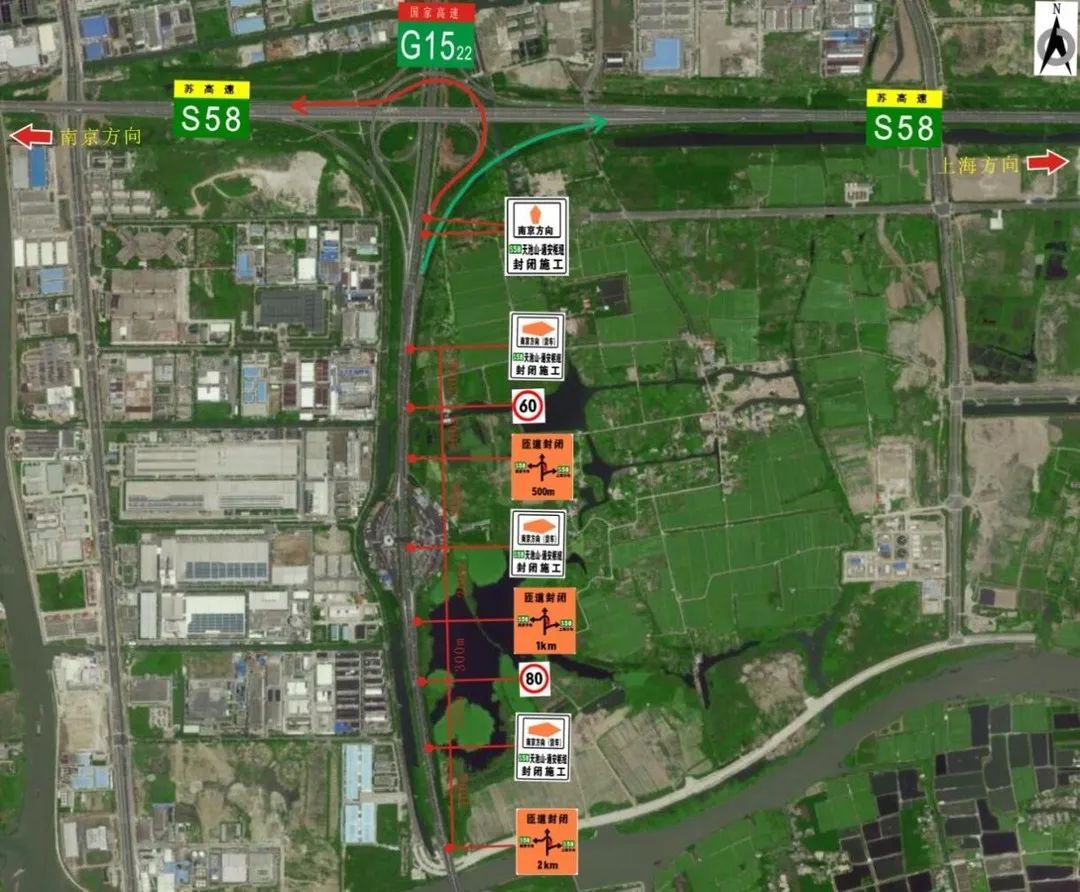 封闭G1522常台高速尹山枢纽南往北转S58沪常高速(南京方向)匝道:G1522常台高速尹山枢纽南往北转S58沪常高速(上海方向)匝道→S58沪常高速(上海方向)→G1521常嘉高速→G2G42沪宁高速绕行
