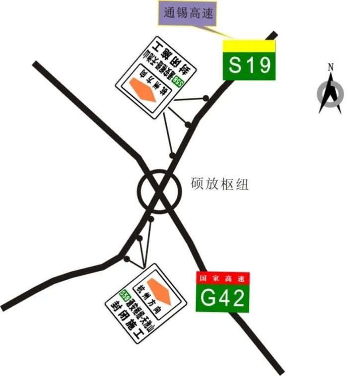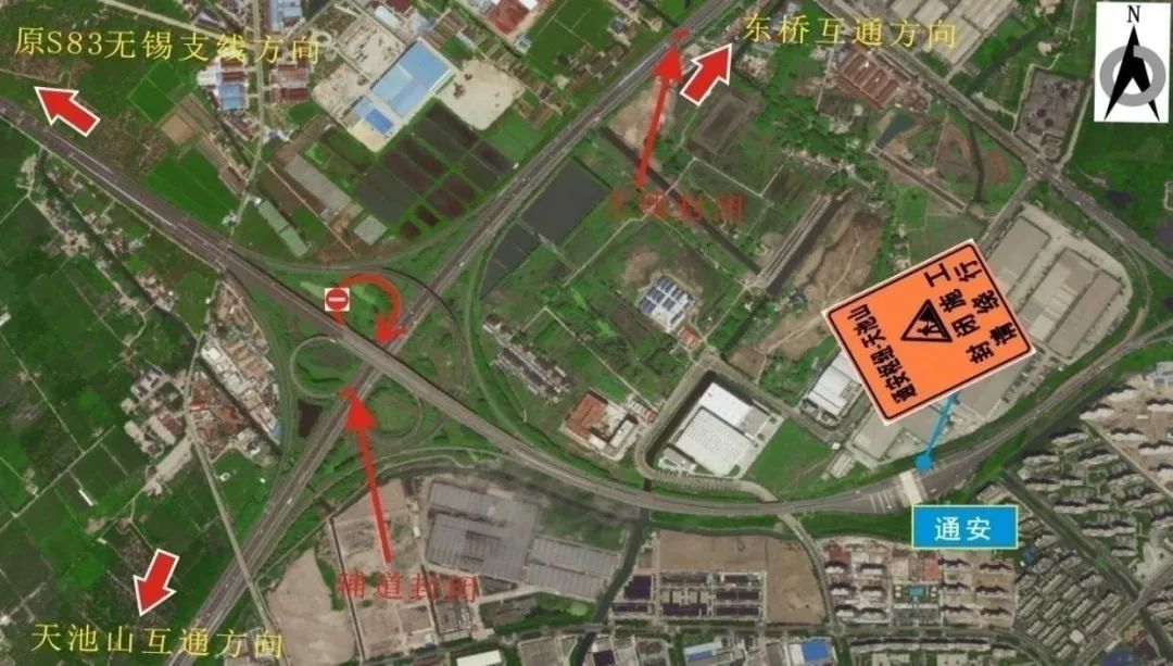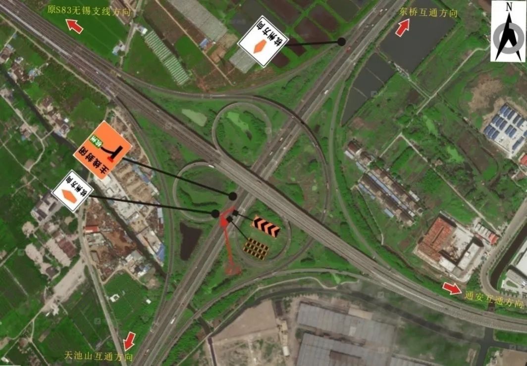 (2)通安收费站外设置“通安枢纽至天池山封闭施工,请绕行”预告标志,同时关闭原S83苏锡线转苏台匝道。