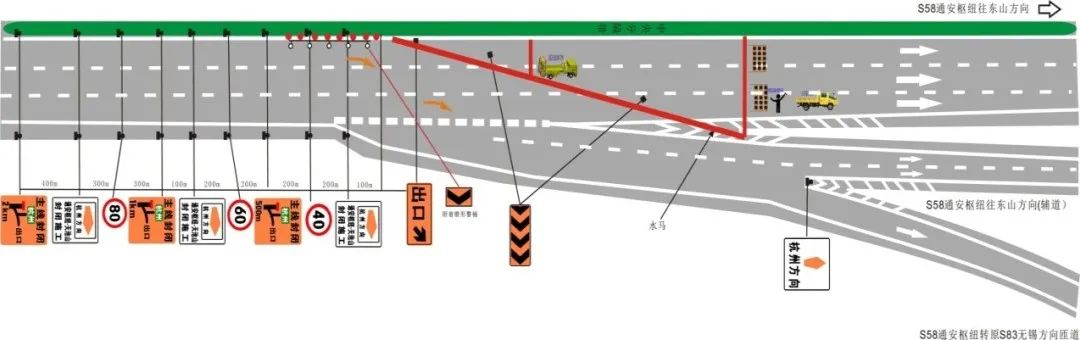 (1)苏台高速主线(上海方向)苏台线转原S83苏锡线匝道前开始设置通安枢纽至天池山主线封闭,杭州方向请绕行、主线封闭2Km﹑主线封闭1Km﹑主线封闭500m三级预告标志﹑限速80﹑限速60﹑限速40及诱导标志、主线用水马及路栏隔断。