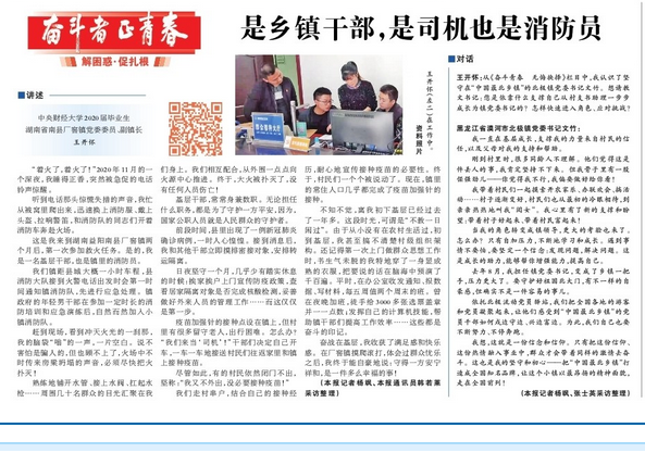 2022年6月26日,《光明日报》头版以《是乡镇干部,是司机也是消防员》为题,报道我校2020届毕业生,湖南省南县厂窖镇党委委员、副镇长王开怀的故事。下面,一起来听!