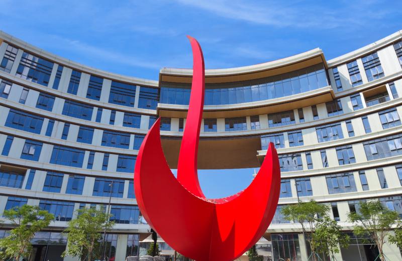 2022年6月,香港科技大学(广州)校园实景:广场中心的“红鸟日晷”雕塑是港科大及港科大(广州)的标志。