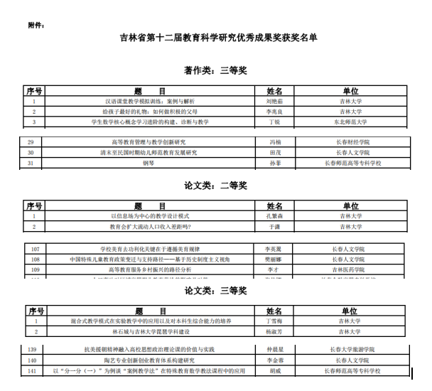 6月30日,吉林省教育科学研究领导小组公布了吉林省第十二届教育科学研究优秀成果奖名单,我校共4名教师获奖。其中著作类三等奖1项、论文类二等奖2项、论文类三等奖1项。