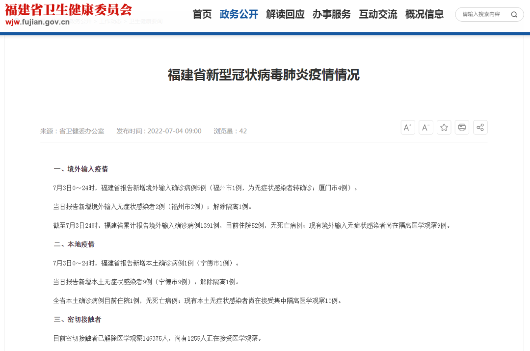 7月3日0~24时,福建省报告新增本土确诊病例1例(宁德市1例)。