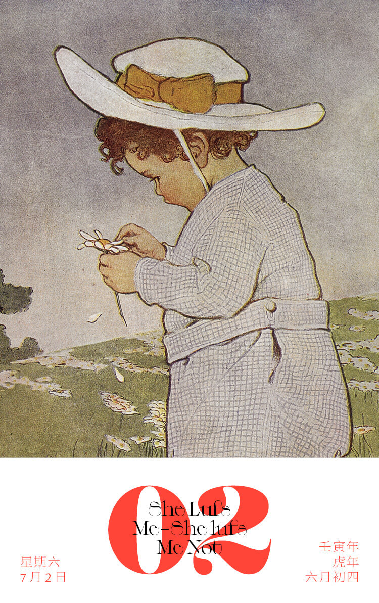 这幅插画出自美国作家安娜·查平编辑的《现代童话故事集》,出版于1922年。在插图当中,身穿蓝色格子衣服的小男孩站在一片盛开的花丛里,表情专注地揪着手里的雏菊花瓣。你知道他在干什么吗?