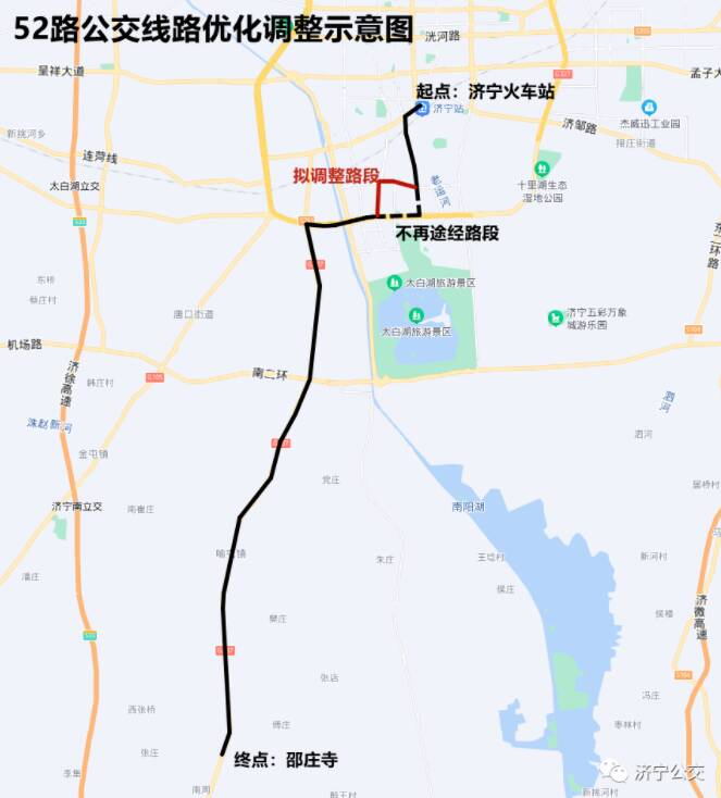 (三)优化调整后途经站点:济宁火车站—口腔医院洋桥院区—南苑社区—运河路高架桥—运河路渔皇路—吾悦广场—市人社服务中心(鲁泰控股)—京杭路公主路—龙贵购物广场—许庄—山东理工职业学院—理工学院南门—孙井小区—济宁大道换乘站—运河之都驾校—单庙村—景村—大张庄—半边店—张桥—郝庄—唐口中学—魏楼—姚庄—大流店—门街—廉屯—王埝—李庄—谭庄—韩庄—洙赵新河—喻屯第一中心小学—喻屯一中—喻屯—经济园区—马店—蔡桁—田庙—喻屯二中—东邵—彭庄—南田—夏王楼—邵庄寺
