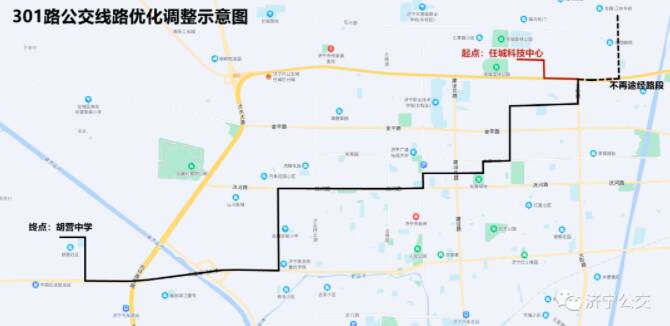 (三)优化调整后途经站点:任城科技中心—育贤家园—薛口家园东门—任城大道火炬路—任兴信息产业园(西)—机电一路科苑路—丰泰园北门—永旺购物中心—舜泰园—新天地花园—市妇女儿童医院—洸河路小学—高鸿胜创数码—军分区第一干休所—市体育馆—市体育馆(南)—益民西区—梦园小区—九九花园—三义庙—博雅佳苑东门—西城实验小学—李楼新村—鲁抗医院—兴唐运河大桥—运河怡居佳苑—胡营小学—运河怡居佳苑B区—胡营中学