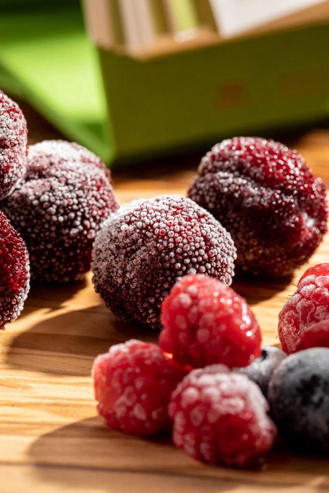 蓝莓、树莓这类莓果,酸酸甜甜,滋味丰富,冷冻后是冰沙感,也还行。