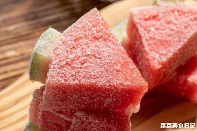 (冻西瓜不需回温,得赶紧吃,化了冰的西瓜软趴趴的)