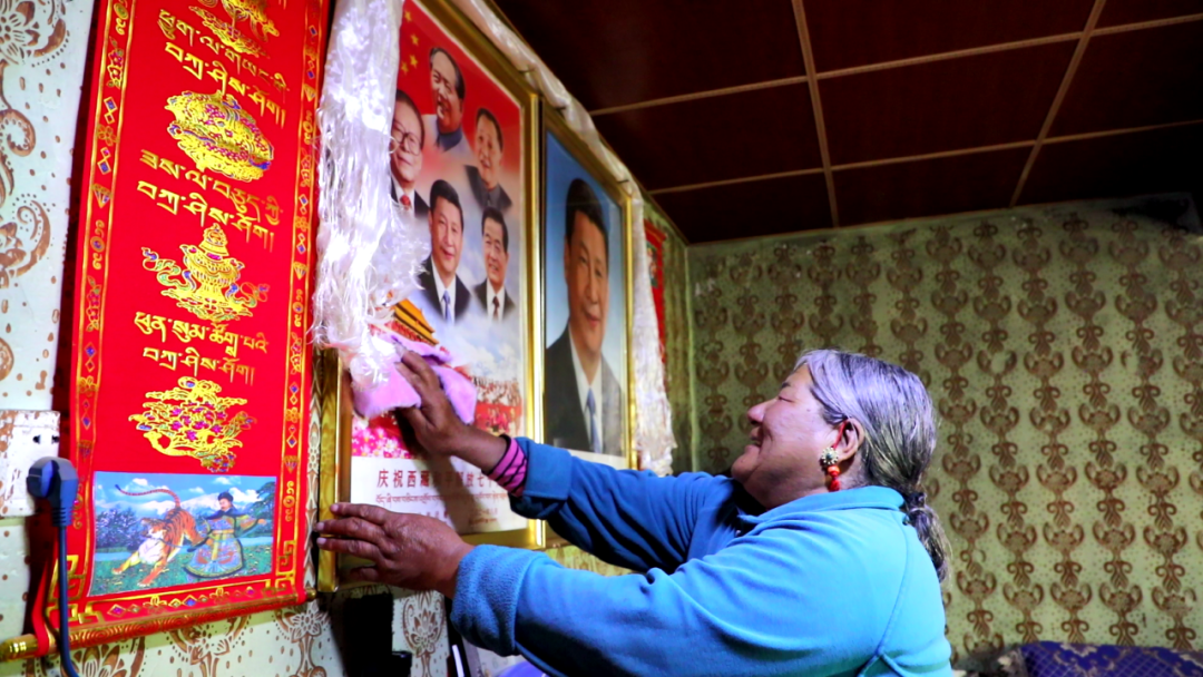 图为仁贡村群众仁青拉姆在易地扶贫搬迁新居里擦拭领袖像。记者 温凯 摄