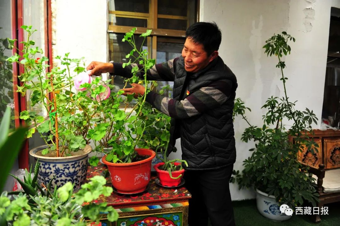 仁贡村党总支书记加央次仁正在家中浇花,随着生活条件的改善当地群众也更加注重美化环境,家家户户都种了不少花草。记者 温凯 摄