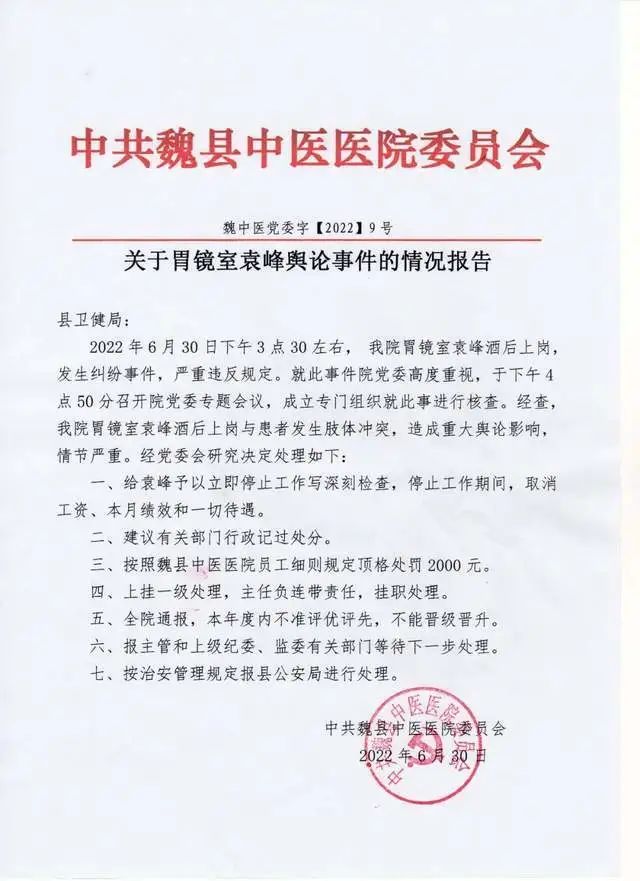 近日,网传河北邯郸魏县中医院一名医生酒后上岗并殴打患者。7月1日,“魏县中医医院”微信公众号发布公告称,6月30日,胃镜室袁峰酒后上岗与患者发生肢体冲突,严重违反规定,情节严重。经研究决定,给袁峰予以立即停止工作写深刻检查,停止工作期间,取消工资、本月绩效和一切待遇,并顶格处罚2000元,主任负连带责任挂职处理,本年度内不准评优评先,不能晋级晋升,报纪委、监委和警方进一步处理。