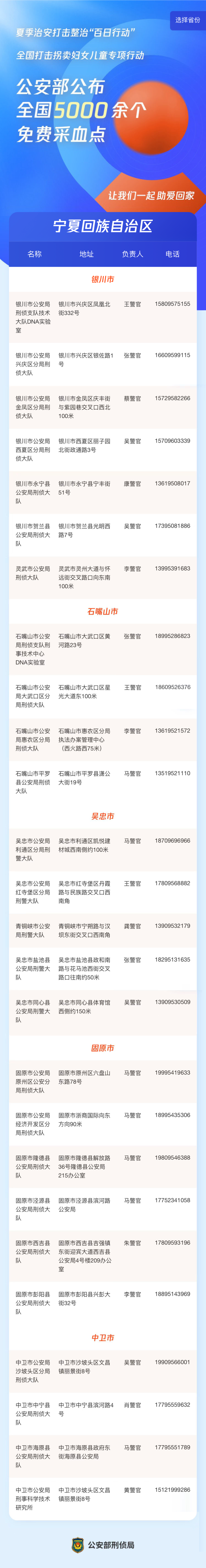据了解,公安部头条号、公安部刑侦局微信公众号和官方微博、公安部儿童失踪信息紧急发布平台已集中发布5000余个免费采血点信息,可及时查询全国采血点情况。同时,支付宝、微信、QQ已设置寻亲便捷搜索,有采血需求人员可在上述平台搜索栏中输入“寻亲”,即可在搜索结果中查看最近的公安机关免费采血点地址和民警联系电话。