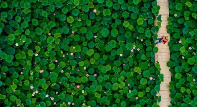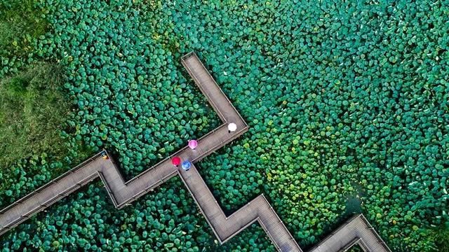乘一艘小船飘荡其中,有种误入“江南水乡”的感觉。水面上一片片的荷叶像撑开的绿伞,亭立在碧波之上,似层层绿波,如片片翠玉。