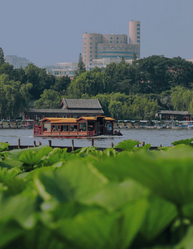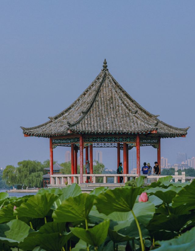 在济南赏荷,必须要去大明湖!此时盛开的荷花已经是湖中最美的风景。在波光涟漪中,大明湖的荷叶碧绿清澈醒目,花朵明艳清丽、一尘不染。