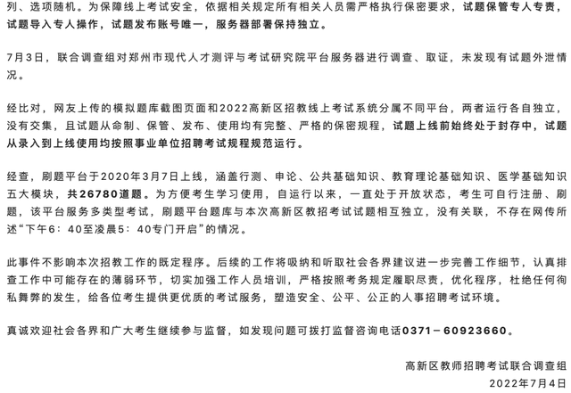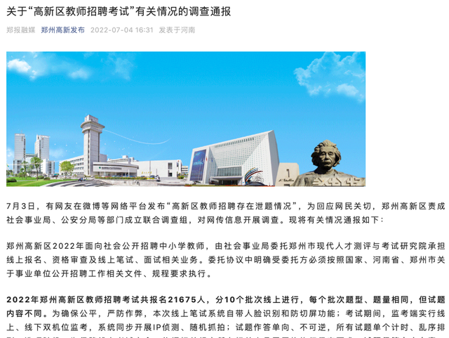 7月3日,有网友在微博等网络平台发布“高新区教师招聘存在泄题情况”,为回应网民关切,郑州高新区责成社会事业局、公安分局等部门成立联合调查组,对网传信息开展调查。现将有关情况通报如下: