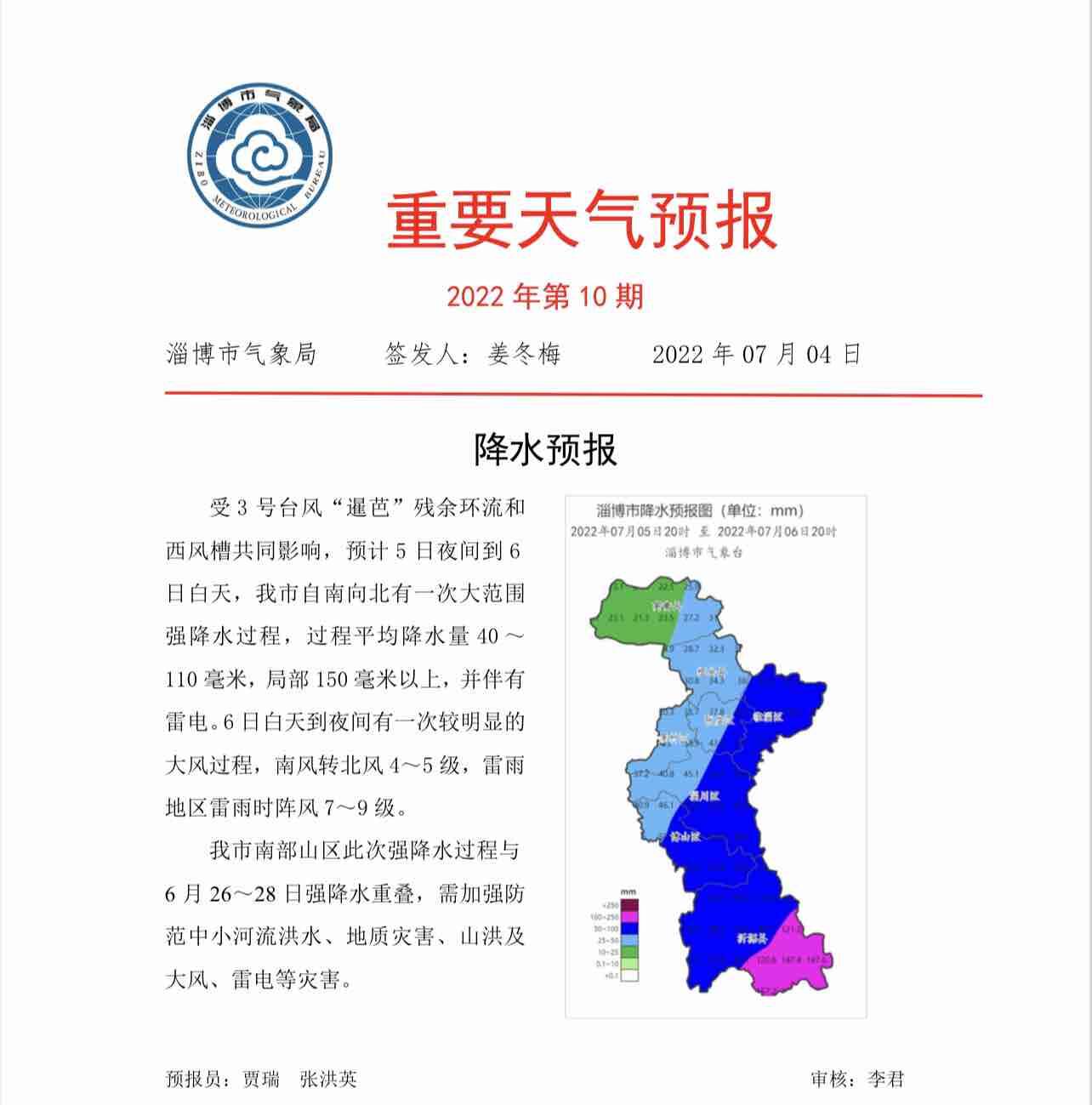 齐鲁网·闪电新闻7月4日讯 今天,淄博发布重要天气预报,受3号台风“暹芭”残余环流和西风槽共同影响,预计7月5日夜间到7月6日白天,淄博市自南向北有一次大范围强降水过程,过程平均降水量40~110毫米,局部150毫米以上,并伴有雷电。7月6日白天到夜间有一次较明显的大风过程,南风转北风4~5 级,雷雨地区雷雨时阵风7~9 级。