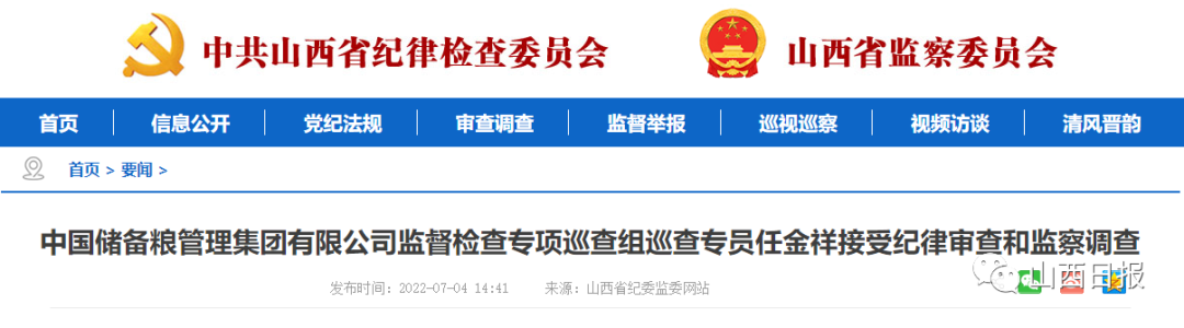 中国储备粮管理集团有限公司监督检查专项巡查组巡查专员任金祥涉嫌严重违纪违法,目前正在接受中国储备粮管理集团有限公司纪检监察组纪律审查和山西省监察委员会监察调查。