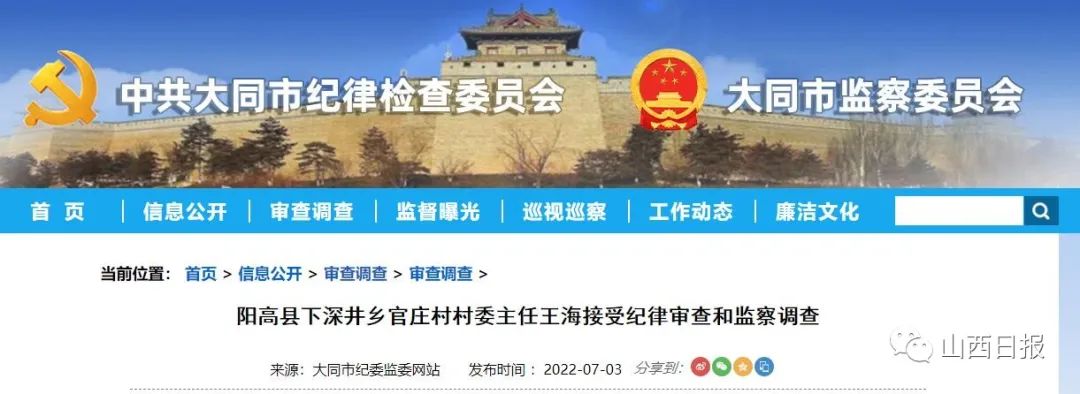 阳高县下深井乡官庄村村委主任王海涉嫌严重违纪违法,目前正在接受阳高县纪委监委纪律审查和监察调查。